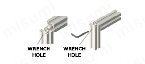 | Wrench holes at specified positions | AH/BH/CH/DH/EH AV/BV/CV/DV/EV AP/BP/CP/DP/EP | ![]() | This is an additional process to drill a wrench hole (φ8) at any position. It can be used when fastening blind joints at locations other than the Aluminum Frames end. ・ Up to five holes can be drilled in each of the horizontal, vertical, and cross directions. [!] If you require six or more wrench holes, our catalog non-standard product service. | |